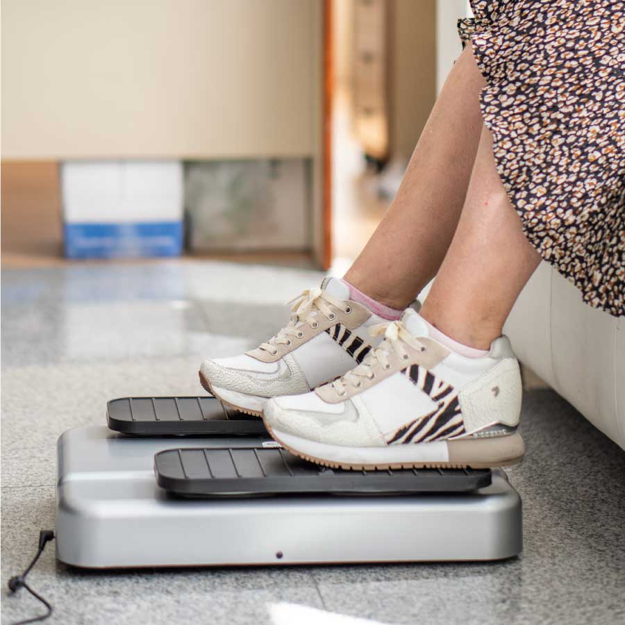 - Sit in a comfortable chair and place your feet on the platforms of the machine.