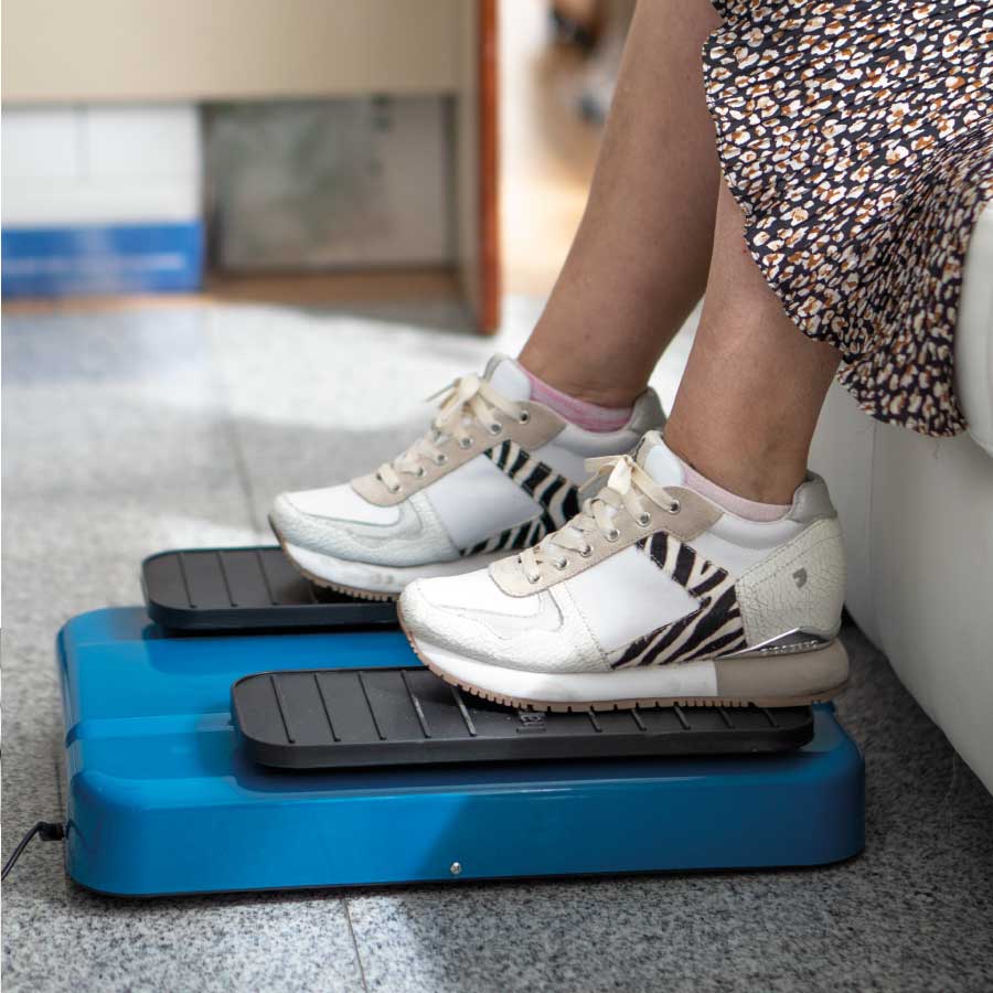 - Sit in a comfortable chair and place your feet on the platforms of the machine.